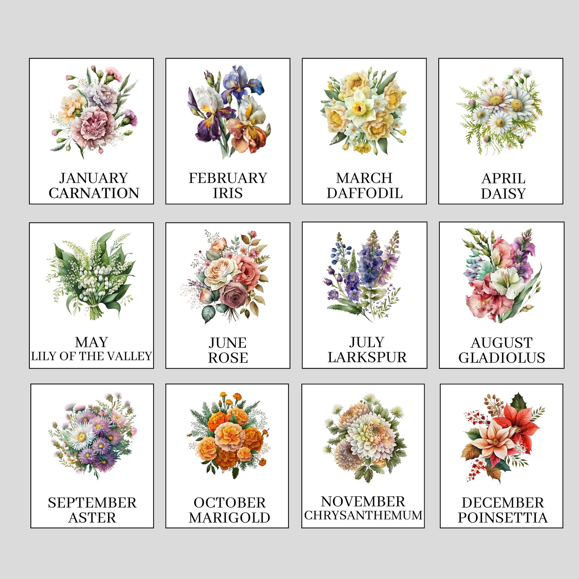 - Names and Birth Month Flower Selection (ie. Megan - August, William - October, Charlotte - January, etc.)